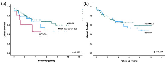 The median follow-up of the patients was 3.25 years (0–10.00 years). Of 34 deceased patients (33.3%, median 1.27 years after transplantation, range 0–7.58 years), 10 patients (9.2%) died during their inpatient stay (median 12 days after surgery, range 0–202 days). As expected, a survival analysis broken down into preoperative Milan and UCSF criteria showed no significant difference (p = 0.193, Figure 1a), although patients with UCSF-in tumors and patients outside Milan and UCSF seem to have a lower survival rate. The hypothesis was then checked whether there was a difference in survival depending on the MELD listing. The survival analysis (Figure 1b) of patients who were assigned an organ with a labMELD and patients with a matchMELD showed no statistically significant difference (p = 0.759). This result did not change when looking at the survival after diagnosis. Of note, the current follow-up of the patients with an organ age of 86 years were 3 and 10 years.