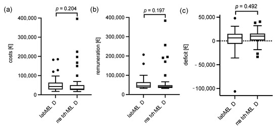 Cost analysis: Presented are (a) costs; (b) remuneration and corresponding (c) deficit for the labMELD and matchMELD cohorts in EUR (€), respectively. All differences are not significant.