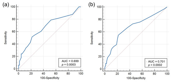 For preoperative prediction of a deficient hospital stay, we performed linear and logistic regression analysis. In the multivariate linear regression, maximum labMELD (p = 0.037) and the labMELD at the time of transplantation (p = 0.044) were highly significant. The deficit increased by EUR 576 per increase in the maximum labMELD or by 580 EUR per increase for the labMELD at the time of transplantation. A cut-off analysis for the labMELD score was carried out using a receiver operating characteristics (ROC) curve. Figure 3 shows the ROC curves for the maximum measured labMELD (a) and the labMELD at the time of the transplantation (b). The Youden index is a MELD score of >13 points for the maximum labMELD and >12 points for the labMELD at the time of transplantation. Both results are significant at p < 0.001.