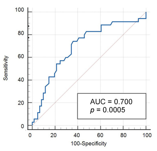 Despite numerous postoperative predictors in univariate analysis, the multivariate logistic regression showed only the need for a new operation (p < 0.001), the reinfection with multiresistant germs (p = 0.020) and dialysis (p = 0.017) to be significantly associated with a deficit. The multivariate linear regression showed the duration of the transplant operation (p = 0.012) as well as the need of erythrocyte concentrates (p < 0.001) and fresh frozen plasma concentrates (p = 0.025) significantly associated with a deficit. The financial deficit increased by EUR 86.50 per minute of surgery and by EUR 1300 and EUR 680 per erythrocyte or fresh frozen plasma concentrate. To check the quality of the parameter “operation time” as a criterion for assessing a deficit case, a ROC curve was created (Figure 4). The Youden index is an operation duration of >273 min (p < 0.001).