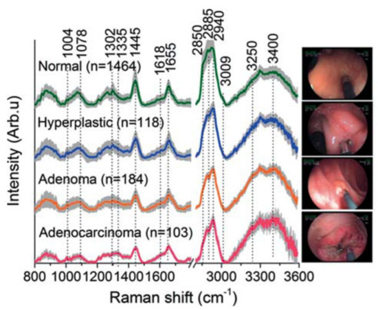 Prominent tissue Raman peaks are observed in the fingerprint of 800–1800 cm−1 and the high frequencies 2800–3200 cm−1, spectral regions. A characteristic example of Raman spectra could be this from colorectal tissues by Bergholt et al. Τhey performed discrimination between normal, hyperplastic, adenoma, and adenocarcinoma using near-infrared Raman spectroscopy [55]. Figure 1 shows the mean of in vivo Raman spectra of normal (n = 1464), hyperplastic polyps (n = 118), adenoma (n = 184), and adenocarcinoma (n = 103) acquired from 121 lesions of 50 patients during colorectal endoscopy. The strongest Raman bands are marked upon the spectra and are related to specific vibrations in cellular or extracellular components: 853 cm−1 (ν(C–C) proteins), 1004 cm−1 (νs(C–C) ring breathing of phenylalanine), 1078 cm−1 (ν(C–C) of lipids), 1265 cm−1 (amide III ν(C–N) and δ(N–H) of proteins), 1302 cm−1 (CH2 twisting and wagging of lipids), 1445 cm−1 (δ(CH2) deformation of proteins and lipids), 1618 cm−1 (ν(C=C) of porphyrins), 1655 cm−1 (amide I ν(C=O) of proteins), 2850 cm−1 and 2885 cm−1 (symmetric and asymmetric CH2 stretching of lipids), 2940 cm−1 (CH3 stretching of proteins), 3009 cm−1 (asymmetric = CH stretching of lipids). Bands above 3200 cm−1 are OH stretching modes of water.