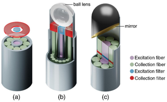 Different geometries of fiber-probes used in clinical applications: (a) non-superficial endoscopic probe with one excitation fiber in the center and seven collection fibers arranged around the emitter (b) confocal endoscopic fiber probe with a ball lens (c) fiber probes with mirror (or prisms) [87]. https://doi.org/10.1117/1.JBO.23.7.071210, access on 10 January 2022. PMID: 29956506. Excitation and collection filters are also depicted.