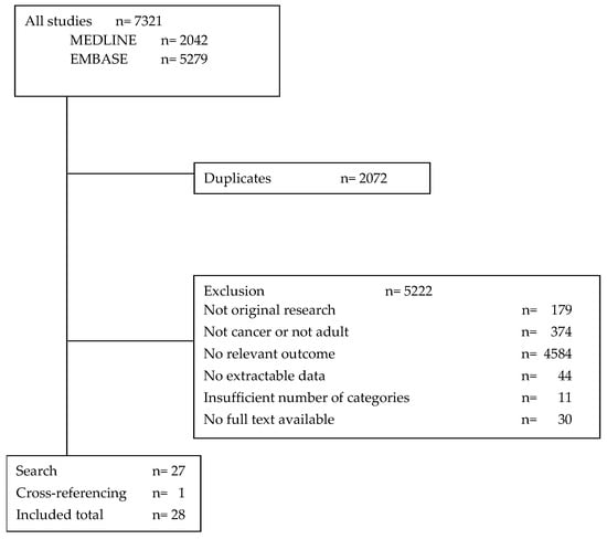 The search resulted in 7321 hits (2042 from Medline and 5279 from Embase). After removing 2072 duplicates and 5222 studies for other reasons (Figure 1), a total of 27 publications were included. Cross-referencing yielded one more publication, resulting in a total of 28 studies in this systematic review.