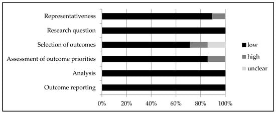 | Author, Year | Representativeness | Research Question | Selection of Outcomes | Assessment of Outcome Priorities | Analysis | Outcome Reporting |