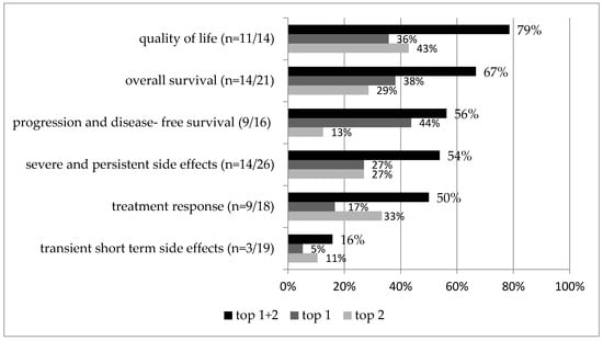 For each study, the highest and second-highest outcome categories are identified and shown in Figure 3 and Table 2 relative to the number of studies that assessed that outcome category. For example, quality of life was assessed in total in 14 studies and was in 11 studies the highest or second-highest priority (n = 11/14, 79%). Overall survival (67%), progression- and disease-free survival (56%), and severe and persistent side effects (54%) were also commonly prioritized. When focusing only on studies addressing a palliative setting, quality of life and overall survival were most important (both in 75%); in contrast, progression- and disease-free survival (67%) and treatment response (67%) were given the highest priority in a curative treatment setting (Table 2, Figure 4).