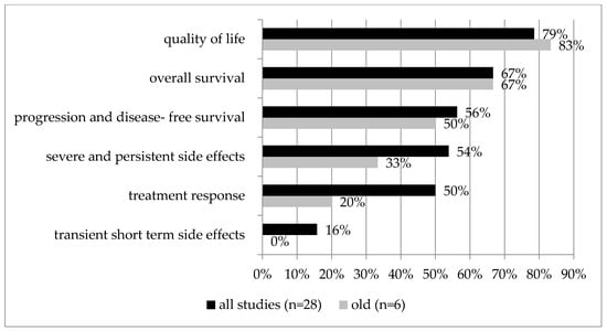 In a subgroup analysis of six studies focusing specifically on older patients [28,36,37,41,47,50] (median age of the study population of 70 years or higher or separate data of this subgroup), quality of life and overall survival were included in five of the six studies. They were also the highest or second-highest priority in most of them (n = 5/6, 83%, and n = 4/6, 67%, respectively), followed by progression- and disease-free survival (n = ½; 50%), severe and persistent side effects (n = 1/3; 33%), treatment response (n = 1/5; 20%), and transient short-term side effects (n = 0/2; 0%; see Table 2, Figure 4).