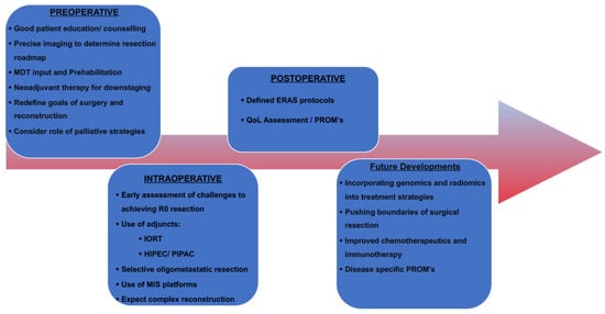 Harji et al. enrolled 145 patients into a dedicated pelvic exenteration ERAS programme to assess its feasibility and short-term impact on this cohort of patients. They demonstrated an overall compliance rate of 70%. Patients with higher compliance to the program tended to have a shorter hospital length of stay, reduced rate and severity of post-operative morbidity, as well as fewer readmissions. ERAS appears feasible and efficacious in patients undergoing pelvic exenteration, displaying a high compliance and improved clinical outcomes []. See Figure 1 for the highlights of contemporary management strategies.