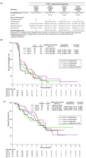 | TEAEs (Grade ≥3) reported in ≥5% of patients by MedDRA Preferred Term a | Arm 1 8 mg/kg Q2W N = 38 | Arm 2 12 mg/kg Q2W N = 42 | Arm 3 6 mg/kg QW N = 41 | Arm 4 8 mg/kg D1D8-Q3W N = 40 | Total N = 161 |