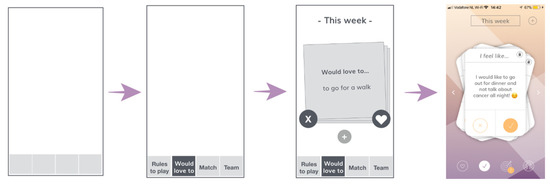 The feedback session was used to present the concept of the different screens and features of the first prototype of the AYA Match app. The visual aspect of the app was developed and presented step-by-step, as shown in Figure 3. The visual elements (e.g., colors, typography, navigation bar and buttons) were designed and adjusted based on the preferences of the patients and loved ones present.