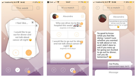 A study by McNeil (2019) indicates that social support from family and peers is of significant importance for AYA cancer patients. This support, however, is a changing concept over time and may thus differ throughout one’s treatment period [22]. Breuer and colleagues (2019) reported that the relationships with loved ones are affecting how the AYA cancer patient feels, by providing support and listening to them. Undertaking activities together, as the AYA Match app stimulates, was experienced as distracting from living with a disease and perceived as pleasant. The participants in the study indicated that it was helpful if loved ones were available and reachable throughout treatment [11]. These studies substantiate the importance of the AYA Match app. By indicating one’s needs for support at individual moments in time, this application responds to the changing aspect of support and facilitates continuous accessible contact with loved ones.