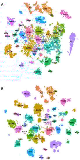 Unsupervised clustering of the cancer genome atlas RNA-seq data using t-distributed stochastic neighbor embedding. (A) t-distributed stochastic neighbor embedding plot showing unsupervised clustering of transcriptome data from the cancer genome atlas without log transformation (B) t-distributed stochastic neighbor embedding plot showing unsupervised clustering of transcriptome data from the cancer genome atlas after log transformation.