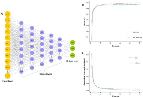 Architecture of deep neural network model and its progress during training. (A) The deep neural network model consists of an input layer, five hidden layers and an output layer. The input layer takes input fragment per kilobase per million mapped fragments values for 13,250 genes. Hidden layers perform nonlinear transformation using rectified linear unit activation function to distinguish between cancer types. There are 5 hidden layers with 500, 250, 125, 100 and 75 nodes. The output layer consists of 37 nodes each representing one of the cancer types. (B) The accuracy and (C) Categorical cross-entropy (loss) of deep neural network model on both training and validation data sets.