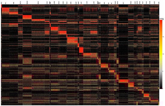 We next used SHAP values to interpret our model to identify gene signatures that drive classification [24]. To identify gene signatures associated with each cancer type, we developed 10 DNN models with the same architecture. Figure 4 shows the workflow employed to identify gene expression signatures. To ensure that non-identical data was used during the construction of each model, the TCGA data set was randomly divided into training (70%), validation (10%), and test (20%) data sets. The performance of all 10 models was consistent and they all achieved 99% and 97% accuracy during training and testing, respectively (Supplementary Figure S1). Next, we calculated SHAP values for each gene using the test data set for the respective model. In each model, the top 20 genes were selected for each cancer type based on absolute mean SHAP values. Then, we calculated the occurrence frequency—number of times a gene was among the top 20 genes associated with a particular cancer type. Only genes with an occurrence frequency of at least 5 for a given cancer type were selected. This resulted in the selection of 507 candidate genes. Only genes that were enriched in less than five cancer types were retained. This resulted in the identification of 448 gene expression signatures. We repeated the above procedure to identify additional gene expression signatures after excluding these 448 genes. During the second iteration, we identified 310 genes and an additional 218 genes in the third iteration. We stopped after the third iteration as we were unable to detect any gene signature for BLCA, ESCA, MESO, or sarcoma (SARC). In total, we identified 976 gene signatures across 37 cancer types (Figure 5 and Supplementary Table S4). There were 55 genes that exhibited liver cancer tissue-of-origin specific expression pattern. Signatures with an occurrence frequency of 10 that were enriched in only one cancer type can be considered highly specific biomarkers. There were 134 such genes associated with 27 different cancer types in the current study (Supplementary Table S4). These 134 genes included well-known cancer biomarkers such as KLK3, which is specific to prostate cancer. Other examples included GFAP in brain cancer (BRAIN), CRYGN in THCA, and NOX1 in CORE (Figure 6). Identification of these cancer tissue-of-origin specific gene signatures demonstrates the validity of our approach.