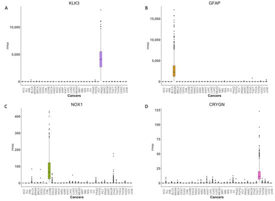 Representative examples of genes that exhibit cancer tissue-of-origin specific expression. Box-Whisker plots showing expression of (A) KLK3, (B) GFAP, (C) NOX1 and (D) CRYGN across 37 cancer types in TCGA data set.