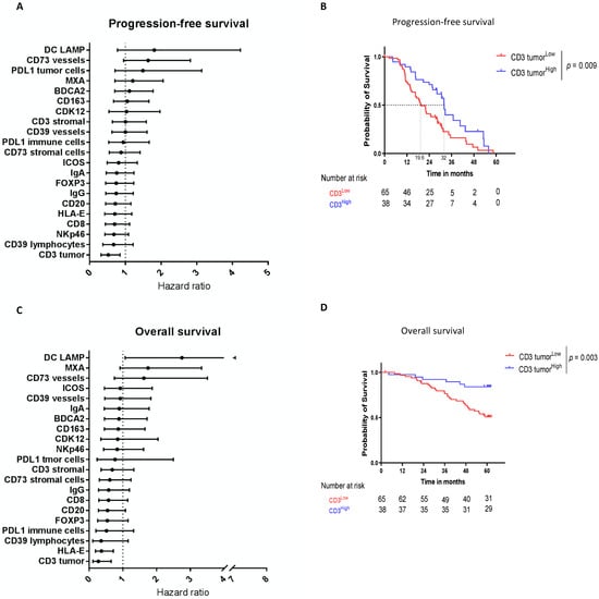 A large panel of 21 biomarkers was assessed by immunohistochemistry (IHC). Intratumoral CD3+ lymphocytes infiltration was the only statistically significant prognostic biomarker associated with a longer PFS (Figure 1A) with a median of 32 months (95% CI [28.1; 53.1]) in CD3high versus 19.6 months (95% CI [16.6; 28.4]) in CD3low (HR = 0.52 [0.32; 0.85], p = 0.009) (Figure 1B) and a longer OS (HR = 0.27 [0.11; 0.65], p = 0.003) (Figure 1C,D). As previously published [13], stromal CD3+ lymphocytes infiltration was not prognostic for PFS (HR = 1 [0.63; 1.59], p = 0.51) and OS (HR = 0.69 [0.36; 1.32], p = 0.7). At the opposite, CD73positive vessels tended to be associated with a worse PFS (median PFS of 21.4 months vs. 32 months, HR = 1.64 [0.95; 2.82], p = 0.07) (Figure 1A).