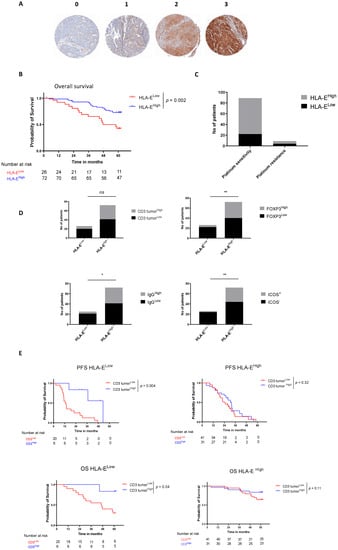 Among 98 assessable samples, 73.5% (n = 72) overexpressed HLA-E (scoring 2 and 3, called HLA-Ehigh) and 26.5% (n = 26) expressed normally or low HLA-E (scoring 0 and 1, called HLA-Elow) on tumor cells. Figure 2A reports examples of histological staining for HLA-E expression on TMAs.