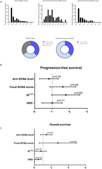 Prognostic and predictive value of genomic instability signatures. (A) Repartition of patients according to genomic scores: histograms for Focal and Arm/chromosomal SCNA scores. Donut charts showing percentages of HRD (n = 39), HRP (n = 28) or unknown (n = 36) patients and percentages of GIhigh or GIlow patients that were stratified by best cutoff of 88. (B) Forest Plots showing the hazard ratio for progression free survival for each genomic signature. (C) Forest Plots showing the hazard ratio for overall survival for each genomic signature. * p < 0.05.