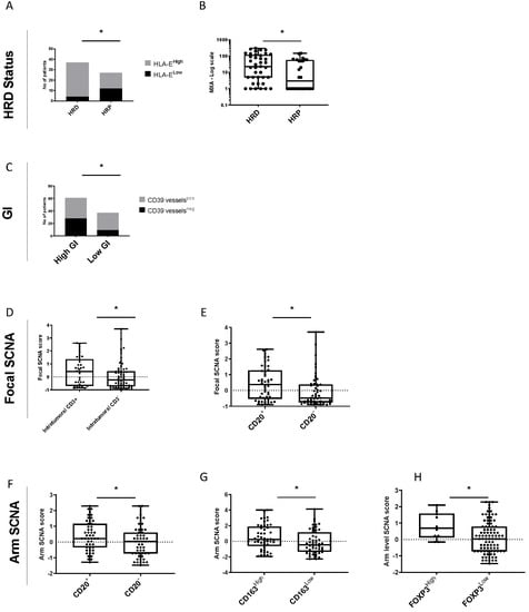 The links between the previous genomic instability scores and the TME were explored. HRD tumors were significantly enriched in HLA-E expression compared with non-HRD (called HRP for homologous recombination proficient) tumors (89% vs. 44%, Chi-squared test p = 0.005) (Figure 4A). Furthermore, IFN-related signature MXA was significantly higher in HRD tumors compared to HRP tumors (Wilcoxon test p = 0.017) (Figure 4B). Furthermore, GIlow tumors were significantly associated with the presence of CD39positive vessels (75.7% in GIlow vs. 54% in GIhigh, Chi-squared test p = 0.05) (Figure 4C). Finally, high focal SCNA was significantly associated with higher rate of intratumoral CD3 (0.41 vs. −0.24, p = 0.06) and CD20 (0.38 vs. −0.48, p = 0.006) (Figure 4D,E) while a high arm SCNA was associated with higher rate of CD20 (0.22 vs. 0.03, p = 0.04), CD163 (0.24 vs. −0.44, p = 0.03), and FOXP3 (0.70 vs. 0.03, p = 0.03) (Figure 4F–H). All results are available in supplemental Figure S3.