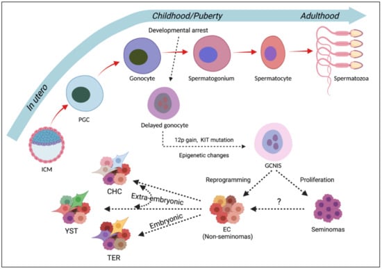 Germ cell development vs. TGCT development. ICM—inner cell mass, PGC—primordial germ cell, GCNIS—germ cell neoplasia in situ, EC—embryonal carcinoma, CHC—choriocarcinoma, YST—yolk sac tumour, TER—teratoma.