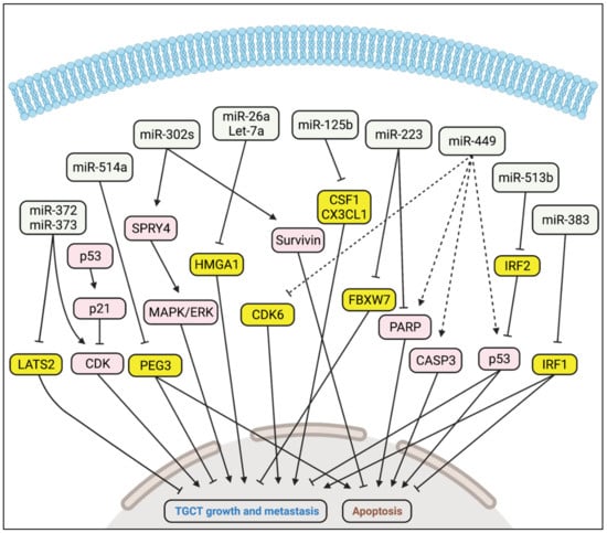 Lize et al. showed that miR-449 was highly expressed in normal testes, while robustly downregulated in TGCTs, indicating a putative tumour suppressor role [69]. They found that E2F1-inducible miR-449a suppressed cell proliferation and promoted apoptosis in HCT116 cells, a human colon cancer cell line. The transcription factor E2F1 plays a key role in cell proliferation, and its uncontrolled activity leads to malignant growth. They also showed that miR-449a reduced the expression of cell cycle protein CDK6, thus possibly counteracting the oncogenic activity of E2F1. De Martino et al. suggested a role of Let-7a and miR-26a in seminomas [70]. They referred to the Cancer Genome Atlas database, showing low expression of Let-7a and miR-26a in human seminoma, and an inverse corelation with HMGA1 expression. They also found that Let-7a- and miR-26a-mediated repression of HMGA1 resulted in reduced cell growth in the seminoma cell line TCam-2. In another study, miR-125b levels were found to be downregulated in TGCT [71]. Overexpression of miR-125b inhibited the TGCT growth by targeting CSF1 and CX3CL1, which are known tumour-derived chemokines, involved in the recruitment of macrophages to the neoplastic sites. Another miRNA, miR-514a, was found to be downregulated in TGCTs [72]. Overexpression of miR-514a in TGCT cells resulted in reduced cell viability and increased apoptosis through targeting the anti-apoptotic paternally expressed gene 3 (PEG3), an activator of NF-κB pathway. miR-383 was also found to be downregulated in TGCT cells, and overexpression of miR-383 resulted in decreased proliferation and increased apoptosis via targeting IRF1, a pro-mitogenic factor [73]. In a follow-up study, Lü et al. found that the transcription of miR-383, as well as miR-320a, was repressed by the co-operative action of long intergenic non-coding RNA162 and nucleolin, thereby increasing proliferation and inhibiting apoptosis [74]. Wang et al. described miR-513 as a tumour suppressor in testicular embryonal carcinoma cells where miR-513 triggered p53 expression by targeting IRF2 [75].
