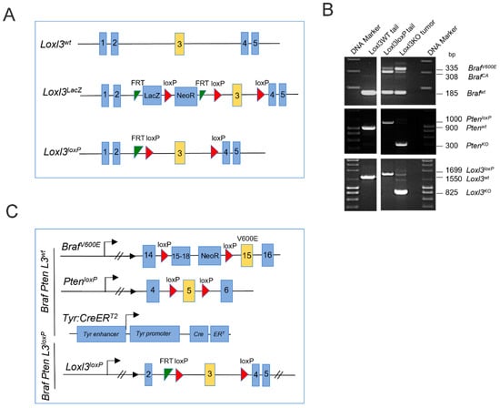 To obtain a melanoma mouse model with selective Loxl3 loss of function, conditional knockout mice for Loxl3 (Loxl3loxP) were first generated as described in the Materials and Methods section and Figure 1A. Loxl3loxP mice were then crossed with Tyr::CreERT2; BrafCA; PtenloxP mice [], and their offspring were intercrossed until appropriate control (Braf Pten L3wt) and experimental (Braf Pten L3loxP) animals were obtained and confirmed by diagnostic PCR (Figure 1B). In these mice, administration of 4-HT resulted in the activation of the conditionally active CreERT2, which was expressed specifically in melanocytes driving the expression of constitutively active BrafV600E and concomitant inactivation of Pten and Loxl3 gene expression (Figure 1C).