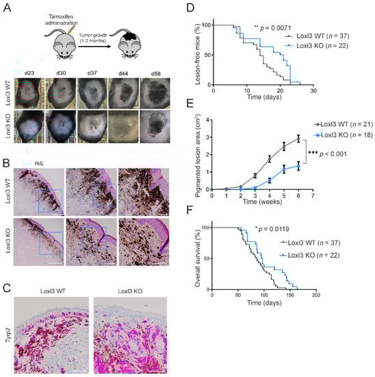 The administration of 4-HT topically on the back skins of Braf Pten L3wt and Braf Pten L3loxP mice (days 1–3 following weaning) led to the appearance of highly pigmented lesions that were detected within 20–30 days (Figure 2A). The lesions (Loxl3 WT or Loxl3 KO) appeared mostly on regions to which 4-HT was applied, as previously described [], and 4-HT-driven genomic rearrangements were confirmed by PCR on relevant tissues (Figure 1B). All the Braf Pten animals that were subjected to 4-HT treatment developed pigmented lesions that eventually progressed to melanomas with different kinetics depending on their Loxl3 genotype (Figure 2A). Histological analysis of the 4-HT-induced primary lesions in Braf Pten mice showed their location at the dermal–epidermal junction (Figure 2B), and their melanocytic origin was confirmed by the immunodetection of Tyrosinase-related protein 2 (Tyrp2) (Figure 2C), an enzyme involved in the synthesis of melanin.
