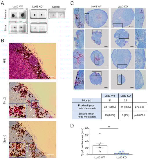 Upon examination of the mice treated with 4-HT, evidence of melanoma spread was clearly seen in lymph nodes (Figure 3A) but not in lungs or spleens, metastatic sites previously reported when 4-HT was administered systemically [,]. Macroscopically, proximal (subiliac) and distant (superficial parotid) lymph nodes were remarkably smaller and showed less pigmentation in mice bearing Loxl3 KO melanomas than in Loxl3 WT tumor animals 42 days upon 4-HT-induced development of melanomas (Figure 3A). Indeed, distant lymph nodes from Loxl3 KO mice resembled those from 4-HT untreated animals that did not develop tumors. To assess the melanocytic origin of the metastatic lesions found, lymph nodes were stained with the melanin enzyme Tyrp2 and with Sox10, a key transcription factor responsible for the establishment and maintenance of the melanocytic lineage [] and a reliable marker for the detection of metastatic melanoma in sentinel lymph nodes [] (Figure 3B). Loxl3 deletion notably inhibited the appearance of metastatic lesions in lymph nodes of animals treated with 4-HT as determined by independent Tyrp2 staining (Figure 3C). In particular, metastatic lesions in distant lymph nodes were detected in only 4% of mice bearing Loxl3 KO melanomas (1 out of 28 mice) while present in 81% of mice bearing Loxl3 WT melanomas (25 out of 31) (Figure 3C). The assessment of the metastatic incidence in local and distant lymph nodes from both mice cohorts and the overall quantification of the Tyrp2-stained area (Figure 3C,D) indicated a role for Loxl3 in melanoma dissemination, independently of Loxl3 involvement in primary tumor growth. This fact was supported by the remarkable inhibition of metastasis incidence detected upon Loxl3 inactivation, likely uncoupled from delayed tumorigenesis.