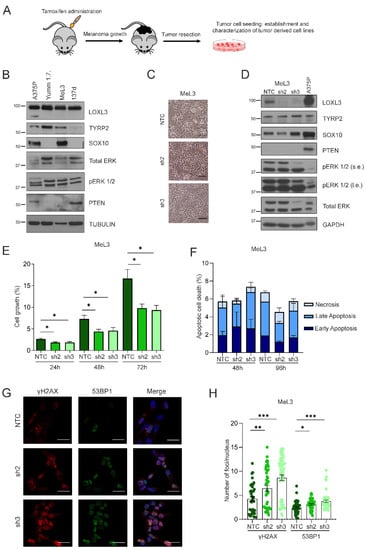 To understand the molecular mechanisms by which Loxl3 contributes to mouse melanomagenesis, we derived primary cell lines from our Loxl3 melanoma mouse model as detailed in the Materials and Methods section and Figure 4A. Several cell lines were established from melanomas grown on Loxl3 WT mice, while no single cell line was derived from those grown on Loxl3 KO animals, despite numerous attempts. The molecular characterization of the established cell lines demonstrated that only one cell line, named MeL3, recapitulated the expected protein expression pattern; i.e., the presence of melanocytic lineage markers Tyrp2 and Sox10, enhanced ERK phosphorylation due to Braf activation, and Pten loss, while most melanoma-derived cell lines, such as 137d, did not (Figure 4B). ERK activation, Pten loss, and Tyrp2 expression also were seen in the YUMM1.7 melanoma cell line derived from induced tumors in the Braf Pten mouse model [], whereas Sox10 and Tyrp2 were expressed by human A375P cells, representative of primary cutaneous human melanoma cell lines (Figure 4B). MeL3 cells displayed a mesenchymal and amelanotic phenotype, common in melanoma-derived cell lines (Figure 4C). Since we were not able to derive any Loxl3 KO cell line, we reasoned that Loxl3 is necessary for melanoma cell survival in 2D growth conditions, as we have previously shown for human melanoma cells []. We then silenced Loxl3 expression in the MeL3 cell line by lentiviral transduction using two specific shRNAs against Loxl3 (sh2 and sh3) and a nontargeting control (NTC) sequence. Although Loxl3 silencing was achieved and maintained over time by both shRNAs without changing the mesenchymal phenotype (Figure 4C) or altering the expression of MeL3 distinctive markers (Figure 4D), the depletion of Loxl3 significantly reduced cell proliferation (Figure 4E). However, Loxl3 silencing did not induce cell apoptosis (Figure 4F), as is the case in human melanoma cells [], but promoted DNA damage, determined by the accumulation of γH2AX and 53BP1 foci in Loxl3-depleted MeL3 cells compared to control cells (Figure 4G,H). Resembling the human setting, Loxl3 supported genome stability in mouse melanoma-derived cells, and the accumulation of DNA damage upon Loxl3 deletion would thus contribute to impaired tumor cell proliferation.