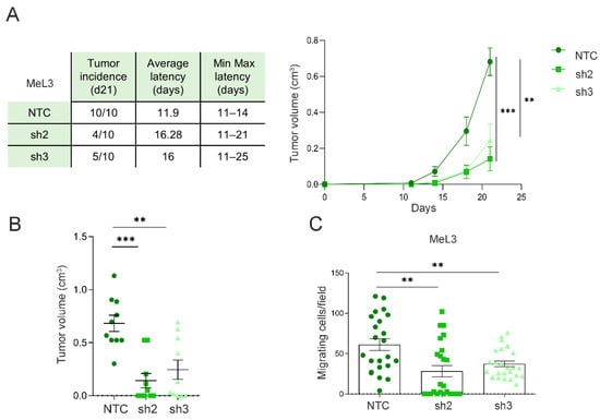 Loxl3 favors melanoma progression. (A) Results from three independent tumorigenesis assays of orthotopically injected control (NTC) and Loxl3-silenced (sh2 and sh3) MeL3 cells in immunodeficient mice. The chart (left) includes the tumor incidence at 21 days after injection, average tumor latency, and minimal to maximal latency of n = 10 tumors per condition. The graph (right) depicts tumor volume growth up until 21 days after cell injection. (B) Volume of tumors originated by control (NTC) and Loxl3-depleted MeL3 cells measured at endpoint (n = 10 tumors per condition). (C) Number of migrated control (NTC) and Loxl3-silenced (sh2 and sh3) MeL3 cells detected 24 h after seeding. Mean ± SEM of three independent experiments is shown (A–C). The p-values were calculated by two-sided unpaired Student´s t-test. ** p < 0.01, *** p < 0.001.