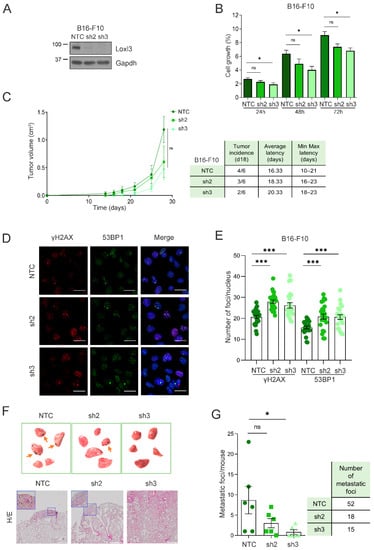 To further assess the involvement of Loxl3 in melanoma progression in an immunoproficient setting, we used the highly metastatic B16-F10 mouse melanoma cell line, which can be transplanted into syngeneic C57BL/6 mice []. Loxl3 silencing in these cells reduced cell proliferation significantly upon transduction with sh3 (Figure 6A,B). Accordingly, primary tumors developed in the flanks of syngeneic mice showed a delayed growth upon inoculation of Loxl3-silenced B16-F10 cells compared to those derived from control cells, accompanied by a reduction in tumor incidence and an increase in tumor latency (Figure 6C). We suspected that the highly proliferative ability of B16-F10 cells conceals a stronger impact of Loxl3 depletion, as seen in our previous models. Nonetheless, a clear accumulation of DNA damage was also detected in B16-F10 Loxl3-silenced cells compared to control ones (Figure 6D,E), which could explain their reduced proliferative and tumorigenic abilities, and could support Loxl3’s role in maintaining genomic stability. We indeed observed a diminished ability for clonogenic survival and transformation of B16-F10 cells upon Loxl3 depletion, as determined by anchorage-dependent and -independent colony formation assays, respectively (Figure S1). Compelled by this result, and given the lung colonization ability of B16-F10 cells, we inoculated control and Loxl3-silenced B16-F10 cells in the tail veins of syngeneic mice. De visu analyses and histological characterization of the recovered lungs showed a marked reduction in the lung metastatic burden of Loxl3-silenced cells compared to controls (Figure 6F,G).