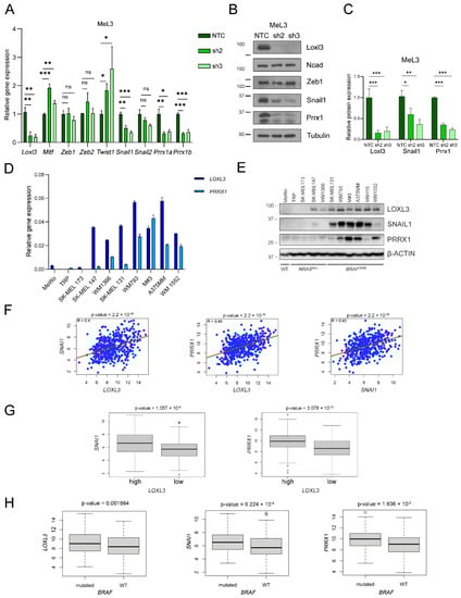 Loxl3 contributes to melanoma cell plasticity. (A) Gene expression analyses of Loxl3, Mitf, and indicated EMT-TFs in control (NTC) and Loxl3-silenced (sh2 and sh3) MeL3 cells relative to internal Gapdh mRNA levels and control cells (NTC). (B) Immunoblot detection of Loxl3; N-cadherin (Ncad); and Zeb1, Snail1, and Prrx1 EMT-TFs in control (NTC) and Loxl3-silenced (sh2 and sh3) MeL3 cells. Tubulin was used as a loading control. Uncropped Western Blots and densitometry analyses can be found at supplementary original figures. (C) Quantification of Loxl3, Snail1, and Prrx1 protein levels from blots depicted in (B) relative to control cells (NTC). Mean ± SEM of n = 4–5 independent experiments is shown. The p-values were calculated by two-sided unpaired Student´s t-test (A,C). * p < 0.05, ** p < 0.01, and *** p < 0.001; ns: not significant. (D) PRRX1 and LOXL3 gene expression analyses in a cohort of human melanoma cell lines relative to L32 mRNA levels. (E) Immunoblot analyses of LOXL3, SNAIL1, and PRRX1 in human melanoma cell lines. Cell lines are grouped based on NRASQ61L- or BRAFV600E-prevalent mutations. WT stands for triple WT subtype, which comprises melanomas lacking hot-spot mutations in BRAF, RAS, or NF1 genes. Uncropped Western Blots and densitometry analyses can be found at supplementary original figures. (F) Scatter plots of LOXL3 versus SNAI1 (left) or PRRX1 (middle) or PRRX1 versus SNAI1 (right) expression for samples in the skin cutaneous melanoma (SKCM) cohort from the TCGA (n = 469). The red solid line in each figure represents the regression line. Pearson correlation coefficient (R) with significance (p-value) is depicted in each panel. (G) Boxplots showing SNAI1 or PRRX1 expression plotted against normalized LOXL3 mRNA levels in human melanoma samples from the TCGA (high expression n = 287, low expression n = 182). (H) Boxplots showing LOXL3, SNAI1, and PRRX1 mRNA levels according to BRAF mutational status in melanoma samples from the TCGA cohort (n = 469).