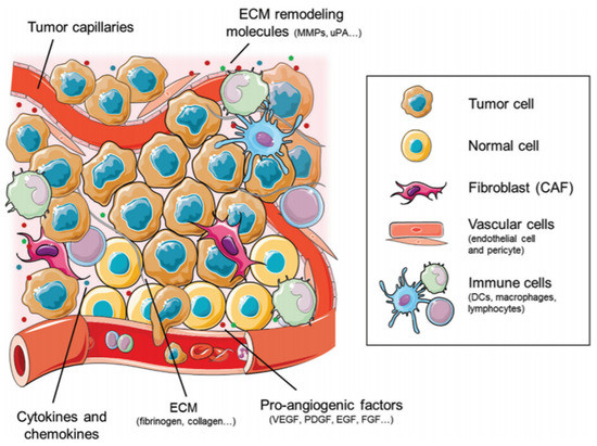 A closer look at the cellular and molecular components of the tumor microenvironment from the immune cells and chemokines to the extracellular matrix and their associated remodeling molecules that shape the interplay between tumor cells and host immune cells along with pro-angiogenic factors, highlighting the potential targets for therapy [49].