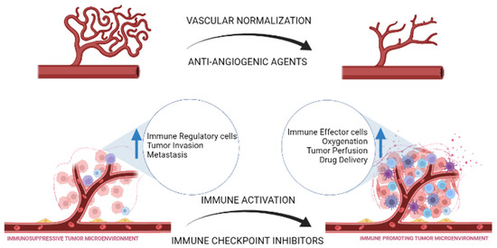 Highlighting the parallel between anti-angiogenic agents and immune checkpoint inhibitors in their effect on the tumor microenvironment and how it impacts tumor progression and drug delivery. Created with biorender.com (accessed on 16 February 2022).