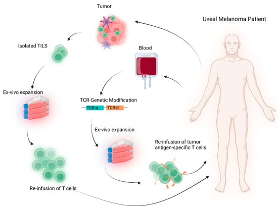 A single-arm, phase II study was conducted to investigate the toxicity and clinical efficacy of the adoptive transfer of TILs in patients with mUM (NCT01814046). In total, 22 patients received lymph-depleting chemotherapy followed by a single infusion of autologous TILs and high-dose of interleukin-2. It is the first report to show the adoptive transfer of autologous TILs to mediate tumor regression in mUM patients [19]. Tumor regression was observed in 35% of patients. Treatment-related toxicities were reported in all patients, which were primarily due to the induction chemotherapy. One treatment-related death due to sepsis and multi-organ failure was reported. Despite the toxicity, these initial results give reason to question the belief that metastatic uveal melanoma is immunotherapy resistant and encourage further investigation of immune-based therapies for this cancer. Accordingly, two other clinical trials are currently investigating the autologous transfer of TILs for mUM patients. The results may provide further information on this strategy’s clinical efficacy and toxicity. However, one of the major limitations of these in vitro expanded T cells is that it is unclear if they have a low affinity to tumor antigens and kill them efficiently.