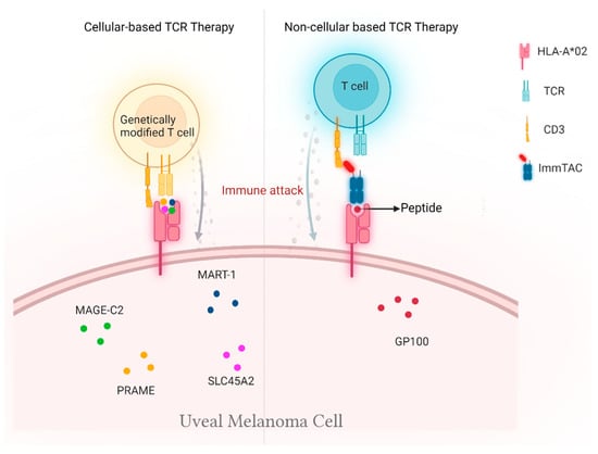 Functional and tumor-specific immune cells are necessary to identify and kill tumor cells accurately and efficiently. Cytotoxic CD8+ T cells are essential for anti-tumor immunity. Usually, T-cell responses are driven by the T-cell receptor (TCR) and human leukocyte antigen (HLA) interactions. TCRs expressed by CD8+ T-cells employ a glycoprotein α- and β-chain heterodimer that recognizes a tumor peptide in complex with HLA class I molecules on antigen-presenting cells or cancer cells. Upon binding a peptide HLA complex on the cancer cell, a non-covalent oligomeric complex comprising TCR and CD3 signaling molecules initiates signaling activity and enables antigen-specific tumor cell lysis. The strength of the TCR affinity for peptide and HLA complexes determines the activation of lymphocytes. As HLA molecules present both intra- and extracellular tumor proteins, TCRs can be engineered to identify and target tumor antigens that were previously less targetable, suggesting the potential of TCR-based therapies for targeting non-immunogenic cancers such as UM.