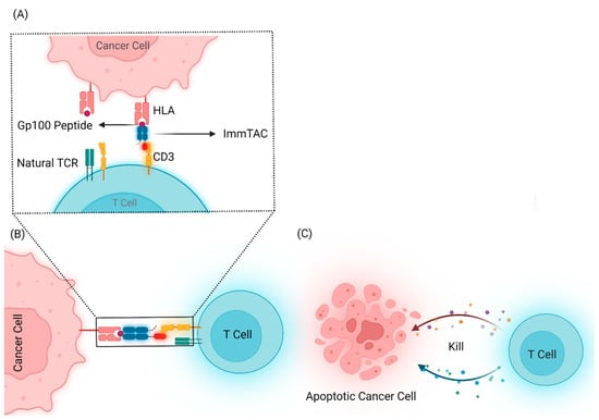 Immune-mobilizing monoclonal TCRs against cancer (ImmTAC) molecules are the leading engineered synthetic soluble TCR molecules that are developed to recognize both tumor and T cells. ImmTAC combines a TCR-based targeting system with anti-CD3 antibody fragment effector function [35]. The strong picomolar affinity of engineered TCRs to peptide-HLA results in the coating of tumor cells by ImmTACs. Upon binding, ImmTAC molecules recruit T cells into the TME via interaction between anti-CD3 fragment effector and CD3 and drive selective tumor killing (Figure 3).