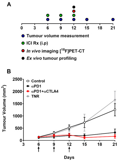 (A) Schematic representation of timeline showing dosing, measurement and imaging regimen. Mice (n = 10–15) were i.p. treated with control IgG, αPD1 monotherapy or combined αPD1 + αCTLA4 on days 6, 9, and 12 post tumour implantation. (B) Average tumour volume of CT26 tumour-bearing mice on days 6, 9, 12, 15, 19 and 21 post tumour implantation. Data are represented as the mean ± S.D. Data are shown post therapy response separation and represented as the mean ± S.D. (TNR, treated non-responder).