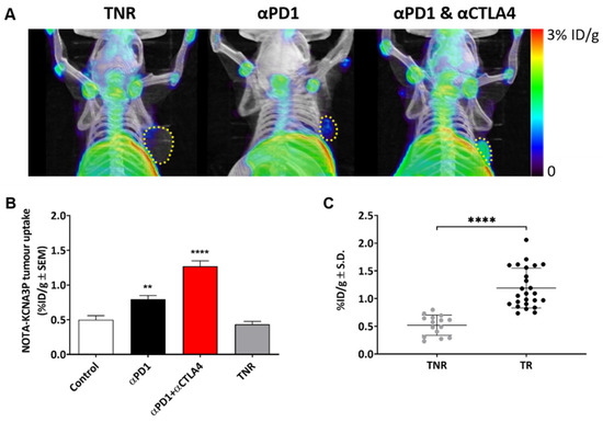 Tumour uptake of [18F]AlF-NOTA-KCNA3P was heterogeneous depending on treatment regime and treatment efficacy (Figure 3A) with a tumour-to-blood ratio (TBR) of ~2 in tumour responders and a TBR of ~1 in tumour non-responders (TNRs). Low tumour uptake of [18F]AlF-NOTA-KCNA3P was measured in the TNRs and the control treatment arm. Significantly greater tumour retention was measured in the responding treatment arms (TRs); αPD1 monotherapy (* p < 0.05, n = 7) and αPD1 + αCTLA4 combination therapy (** p < 0.01, n = 10), when compared to the TNR group, n = 9). Tumour uptake of [18F]AlF-NOTA-KCNA3P was sufficient to distinguish from background and differentiated responsive tumours from treated non-responders (Table 1 and Figure 3B,C) in vivo. Ex vivo biodistribution was used to confirm the imaging results (Supplementary Figure S5). Importantly, no difference was seen between non-responders and responders in the biodistribution of [18F]AlF-NOTA-KCNA3P in muscle, blood, lung, skin, heart and brain, the only difference being in the tumour (Supplementary Figure S5). Furthermore, Western blot analysis of excised tumours showed that tumour response to treatment was associated with increased expression of Kv1.3 (Supplementary Figure S6).