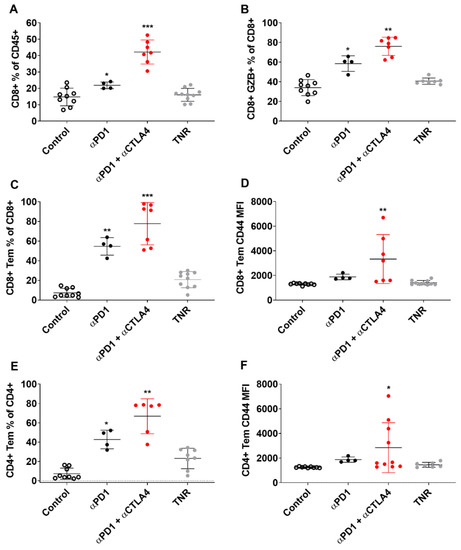 Tumour-infiltrating immune cells were measured in each of the treatment groups and separated into TRs and TNRs (Figure 4 and Figure 5). t-SNE and Rphenoptype clustering provided a measure of the immunophenotypic changes associated with treatment response or lack of response in each treatment cohort. Rphenograph clustering identified CD8 T cells (clusters 1, 2, 11), CD4 T cells (clusters 6, 8, 17), NK cells (clusters 9, 15), CD11b myeloid cells (clusters 7, 12, 14), Ly6G-positive neutrophils (cluster 3), and SiglecF-positive eosinophils (cluster 10) (Figure S9A). The different immune cell populations associated with treatment response and treatment non-response are listed in Supplementary Table S6. The greatest differences were measured in tumour-associated CD8+ T cells (CD8+, GZB+ CD8+ and CD8+ TEM T cells, Table 2). Separation of the t-SNE based on treatment response or lack of response in each treatment cohort revealed the strongest increase in cluster 1 in ICI-responsive tumours compared to TNRs, which corresponds to CD8+ TEM cells (Supplementary Figure S9B). Manual gating for quantification and statistical analysis is shown in Supplementary Figure S10. CD8+ TEM tumour infiltration as a % of CD8+ cells was significantly higher in αPD1 monotherapy (** p < 0.01) and αPD1 + CTLA4 combination therapy (** p < 0.01) TRs compared to TNRs.