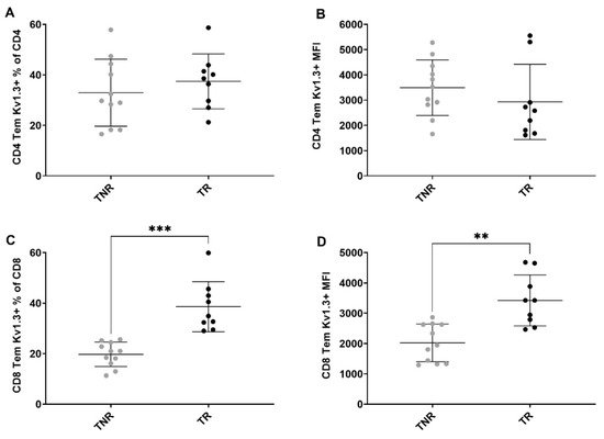 Multicolour flow cytometry analysis of tumour-associated Kv1.3-expressing T cells after treatment. Percentages of (A) Kv1.3 CD4+ TEM cells relative to total CD4+ cells (B) CD4+ TEM cells relative to total CD4+ cells MFI (C) Kv1.3 CD8+ TEM cells relative to total CD8+ cells MFI (D) Kv1.3 CD8+ TEM cells relative to total CD8+ cells MFI between TR and TNR. Data are shown as individual values with the mean ± S.D. and are representative of n = 8–10 mice/ group. ** p < 0.01; *** p < 0.001 TR compared to TNR.