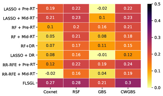 | LASSO+DR | CWGBS | pre-/mid-RT | 1–6 | 0.45 (0.40–0.51) | 12 |