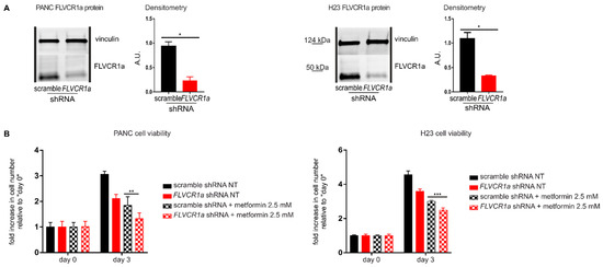 Seminal works have highlighted the crucial role of heme metabolism in pancreatic cancer and lung cancer [21,22,23]. Moreover, metformin applicability to counteract pancreatic and lung cancer has already been proposed [24,25,26,27]. In order to verify whether the sensitizing effect of the inhibited heme synthesis-export system to metformin is restricted to CRC cells or can be extended to other kinds of tumor cells, we moved to the analyses of pancreatic cancer (PANC) and lung cancer (H23) cell lines. Upon FLVCR1a silencing (Figure 3A and Figure S2D,E), we detected decreased cell growth (Figure 3B). In addition, we observed increased sensitivity to metformin (Figure 3B), confirming the data obtained in CRC cell lines.