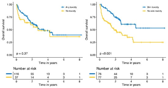 Survival curves based on Kaplan–Meier methods and a log-rank test were used to investigate differences in post treatment OS with respect to global and skin toxicities. Curves were calculated using the ‘survfit’ function in the ‘survival’ package and plotted with the ‘survminer” package in R [32,33,34].