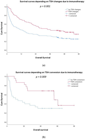 The mechanism of thyroid dysfunction on ICIs is still unclear; a biphasic course of irTAEs is caused by the acute inflammation and destruction of thyroid glands. The transient thyrotoxicosis is followed by hypothyroidism, which resembles classical thyroiditis. This specific biphasic course of thyroid dysfunction is named “TSH conversion”. In our study, a TSH conversion was associated with a two-times higher 3-year OS rate (68% vs. 33%. p = 0.009). A TSH conversion was observed after a median of three months. In the study presented by Freemen-Keller et al., only two cases with hyperthyroidism were presented with a median time to onset of 9.1 weeks, and one of them had a TSH conversion [22].