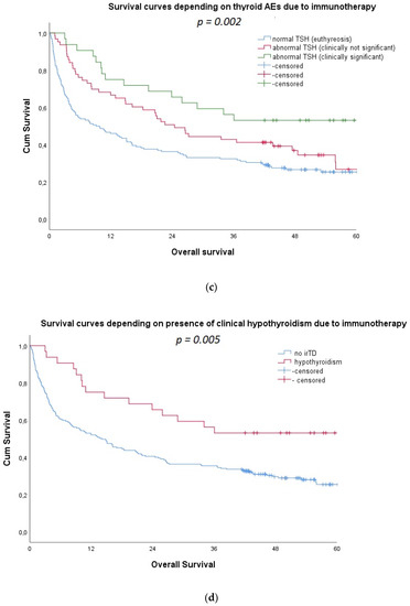 Overall survival (OS), defined as the length of time from the first day of anti-PD-1 treatment until the date of death or last follow-up (censored observation), was estimated by the Kaplan-Meier method. Differences between survival curves were tested with the log-rank test. The correction for length and lead-time bias was performed to eliminate overestimated survival duration related to different time points for TSH changes. A chi-square (χ2) statistic was applied to measure how the expectations compared to the actual observed categorical data. The multivariate Cox proportional hazards model included all statistically significant factors from univariate analysis and evaluated associations between the occurrence of irTAEs and the outcome of all-cause death. IBM SPSS Statistics for Windows (Version 25.0. New York, NY, USA) was used for statistical analyses. p < 0.05 was considered statistically significant. The Institutional Review Bioethics Committee approved this study and confirmed that the patient’s consent to participate in this project was not required due to the retrospective nature of this study.