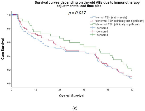 (a–e) Kaplan Meier survival curves depending on: (a) TSH changes, (b) TSH conversion, (c) clinical hypothyroidism, (d) thyroid AEs, and (e) thyroid AEs adjusted to the length and lead-time bias. (time provided in months).