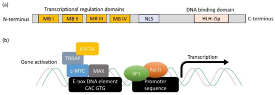 c-MYC was discovered almost 40 years ago as the cellular homolog of v-Myc, a viral oncogene derived from an avian myelocytomatosis virus that caused leukaemia and sarcoma in chicken [16]. Two additional human paralogs were eventually identified: MYCN (N-Myc) and MYCL (L-Myc) that can be found in neuroblastoma and lung cancer samples, respectively [17]. The c-MYC protein contains an N-terminal transcriptional regulatory domain, conserved Myc Boxes (MB) I and II, III and IV, followed by a nuclear localisation sequence (Figure 1a). The C-terminus comprises an essential HLH-Zip domain, which interacts with MYC-associated factor X (MAX) to form a dimer that binds DNA and mediates many of its functions [18]. The heterodimer binds to DNA through the binding motif (5′-CAC GTG-3′) termed E-box [19]. Genome-wide localisation analyses and gene expression profiling have revealed that MYC binds to and potentially regulates the transcription of at least 15% of the genome [20,21]. The N-terminal domain has been documented to recruit transcription factors, such as TRRAP, KAT2A, SP1, etc., to form functional transcription complexes to induce the expression of genes (Figure 1b) [22]. Besides activating transcription, c-MYC has been shown to repress transcription by interacting with MIZ1, resulting in the formation of a complex that can recruit DNA methyltransferase 3a (DNMT3a) [23]. In this manner, c-MYC can repress MIZ1 target genes; some of which belong to cell cycle inhibitors such as CDKN1A (p21) and CDKN2B (INK4B) [23,24].