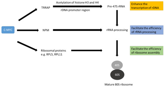 c-MYC has been reported to enhance ribosome biogenesis by various mechanisms (Table 1). First, c-MYC increases the transcription of many ribosomal proteins, translation initiation factors and elongation factors through RNA polymerase II [60,61,62]. Suppression of c-MYC expression in a mouse model of osteosarcoma has been shown to reduce the expression of many ribosomal protein genes [63]. In addition, c-MYC can coordinate the transcription of genes that encode proteins required to process rRNA precursors that contribute to ribosome assembly and the nucleocytoplasmic transport of mature ribosomal subunits [60,64,65]. c-MYC can enhance the expression of nucleophosmin, (NPM1) which is a crucial factor in ribosome biogenesis [66]. NPM1 is involved in multiple steps of ribosome biogenesis, including rRNA processing, ribosomal protein stability and the transport of ribosomal subunits into the cytoplasm [67,68]. Furthermore, c-MYC can up-regulate the expression of TRRAP, which is part of a histone acetyltransferase complex. The complex can increase the acetylation of histones H3 and H4 in the ribosomal DNA (rDNA; the gene encode for rRNA) promoter region to favour the transcription of pre-ribosomal RNA [69,70]. Therefore, overexpression of c-MYC can enhance the production of raw materials and essential factors necessary for ribosome biogenesis (Figure 2). The enhanced ribosome biogenesis sustains the high demand of cancer cells for proteins and other building blocks.