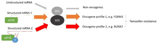 The molecular mechanism mediated by eIF4E to induce tamoxifen resistance in breast cancer. Overexpression of c-MYC enhances the expression of eIF4E that prefers to interact with structured mRNA and favours its translation. mRNAs of oncogenic factors are usually structured. Therefore, eIF4E will favour the protein expression of oncogenic factors. In addition, the activity of eIF4E is regulated by phosphorylation. Phosphorylated and unphosphorylated eIF4E (p-eIF4E) have different selectivity toward structured mRNA. eIF4E and p-eIF4E induce differential protein expression profiles. Therefore, eIF4E and p-eIF4E modulate tamoxifen resistance through different mechanisms.