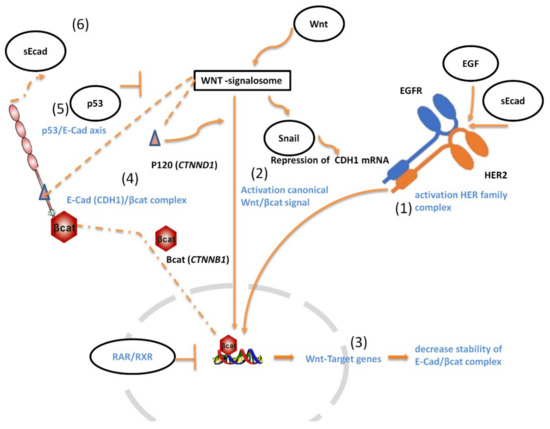 - Brouxhon, S.M.; Kyrkanides, S.; Teng, X.; O’Banion, M.K.; Clarke, R.; Byers, S.; Ma, L. Soluble-E-cadherin activates HER and IAP family members in HER2+ and TNBC human breast cancers. Mol. Carcinog. 2014, 53, 893–906. [Google Scholar] [CrossRef] [Green Version]